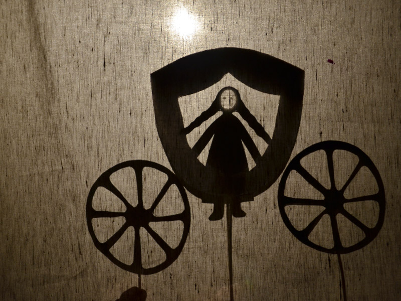 В книге есть еще один ключевой персонаж – маленькая девочка Тиффани, после встречи с которой разбойники буквально переродились. У нас получился новый, не связанный с иллюстрациями образ девочки, но тоже из картона и кальки, на палочке.
