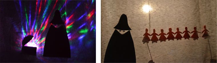Много лет спустя повзрослевшие дети в память о своих добрых опекунах построили три высоких башни с крышами-колпаками. Башни в нашем спектакле – те же фигурки разбойников, но с прикрытыми вставками из кальки.
