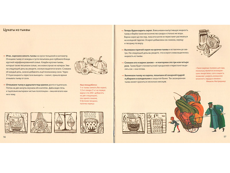 Конечно, на кухню к Нострадамусу стоит заглянуть и просто из любопытства (в конце концов, с любопытства всё часто и начинается). Интересно узнать, что ели, что пили, как готовили когда-то. Этот интерес книга Гелии Певзнер и Марии Марамзиной тоже сполна удовлетворит. В конце даже приведены несколько рецептов Нострадамуса, так что можно попробовать самим приготовить цукаты из тыквы, марципан или «королевское» смородиновое варенье, для которого из каждой ягоды – красной и белой смородины! – удаляли гусиным пером косточки. Авторы без излишнего перфекционизма предлагают косточки из смородины не удалять: будет не так красиво, но все равно вкусно. Но даже если делать все, как написано у Нострадамуса, идентичности все равно не достичь, потому что фрукты и ягоды были в те времена иными: апельсины ‒ горькими, груши – терпкими и мелкими, да и посуду мы сегодня используем другую. Поэтому мы можем только предполагать, какими на вкус были творения Нострадамуса. Впрочем, главное ‒ не идентичность вкуса, а то, что перед нами книжка не только для семейного чтения: ее можно не только прочитать и обдумать, обсудить и внимательно рассмотреть (иллюстрации Татьяны Никитиной и Ольги Золотухиной дают возможность рассматривать ее как художественный альбом), она ‒ для общего семейного действия, а это уже немало, даже если читатели не станут вдумываться в горькую иронию кулинарных достижений Нострадамуса. А еще книга позволяет соприкоснуться двум похожим мировосприятиям – ребенка и первооткрывателя: оба полны удивления, оба заворожены чудом открытий, оба полны нетерпения ‒ «что же получится?»