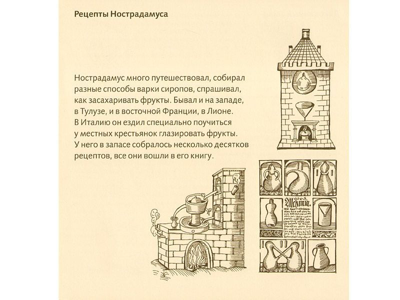 Бесконечно важные для алхимических опытов вещи: материал, из которого сделана посуда, время (сколько варить сироп), ингредиенты – все это вызывает множество детских вопросов и в быту: почему в этой кастрюльке можно, а в той нельзя, почему варенье «пятиминутка», а не «шести»? Понятно, что тут велика доля традиции и привычки, но книжка про Нострадамуса многое объясняет именно потому, что кухня была его алхимической лабораторией. А это уже снова выход в «большую историю», где Нострадамус – совсем не повар, а врач, ученый и маг-предсказатель.