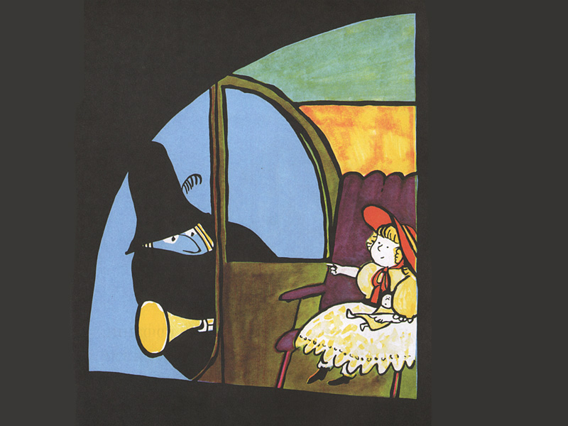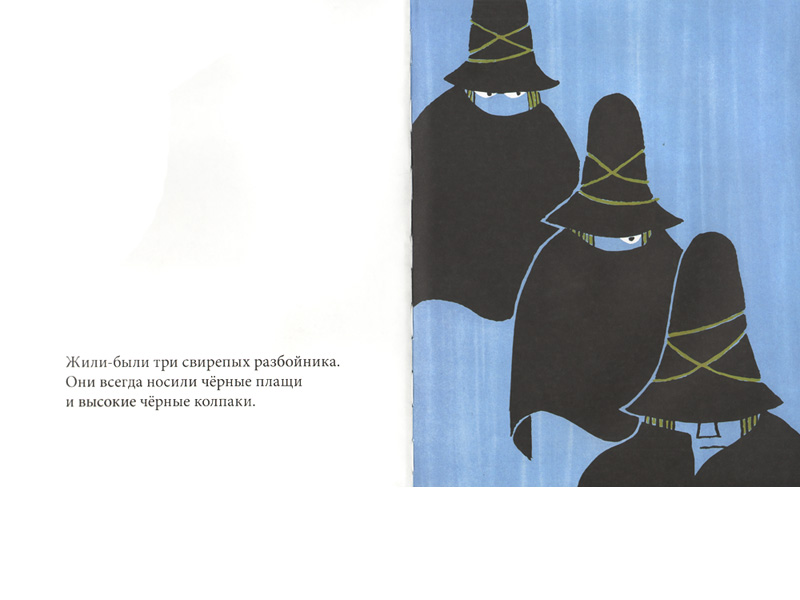 Первая часть книги мрачная, она подробно описывает разбой главных героев. На иллюстрациях много черного, темно-синего, отдельные всполохи красного и желтого. Дети сосредоточенно слушают и внимательно рассматривают иллюстрации, комментируя каждый разворот.