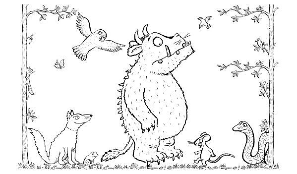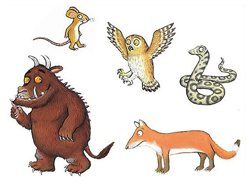 Груффало – один из самых популярных современных книжных героев, две книги о нем читают уже второй десяток лет, они переведены на многие языки, по первой из них сделан мультфильм. Но по прочтении просто напрашивается мысль о спектакле: крупные развороты, лаконичные иллюстрации, на которых персонажи словно выходят на «сцену», а динамичный стихотворный текст так и хочется декламировать. А в интернете можно найти немало шаблонов фигурок зверей, «вырезанных» из авторских иллюстраций Акселя Шеффлера, ‒ цветных и черно-белых для раскрашивания (есть даже целый сайт с идеями и заготовками: gruffalo.com).