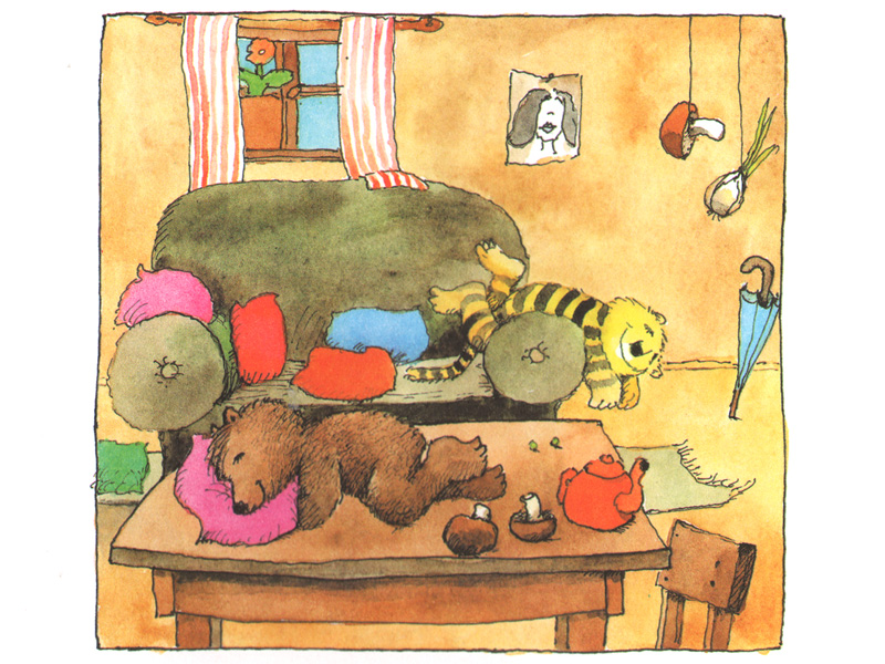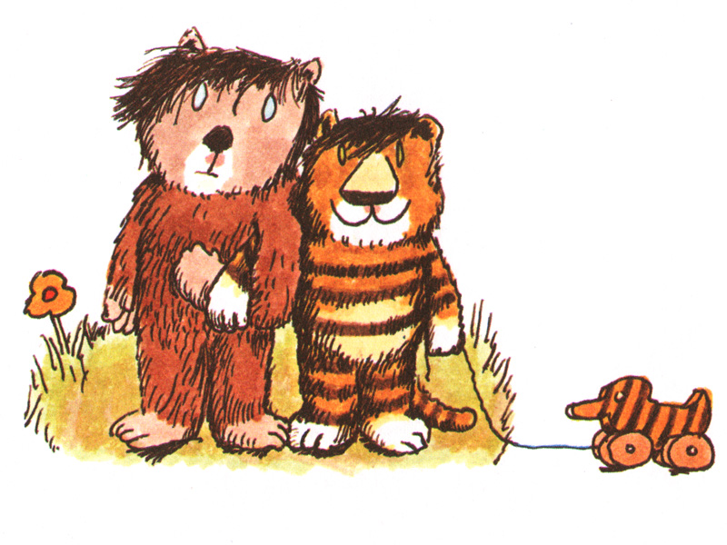 «Жили-были Медвежонок и Тигренок, и не где-нибудь, а у самой речки под большим деревом, в том месте, где к небу поднимается струйка дыма. Они жили в маленьком уютном домике с трубой на крыше. – Хорошо нам живется, – говорил Тигренок. – Все у нас есть, чего душа пожелает. И бояться нам нечего, потому что мы с тобой силачи…»