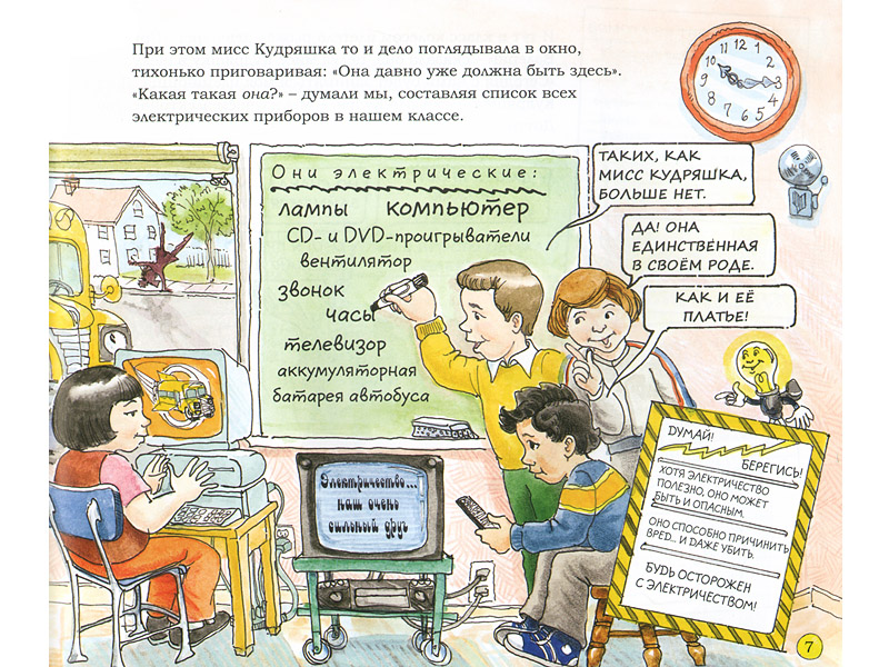 Вообще-то, само по себе выражение «учительница-волшебница» может и не вызывать удивления или недоверия. Ведь по большому счету это, скорее, естественно. И не так уж редко говорят: «Этот учитель – настоящий волшебник! Он так умеет увлечь детей своим предметом!» Подобные представления в книжках про школьный автобус оборачиваются материализованными метафорами. Мисс Кудряшка в буквальном смысле то и дело куда-то «увлекает» своих учеников: «Мисс Кудряшка первой прыгнула к трубе, увлекая всех за собой. Спустя секунду весь наш класс очутился внутри трубы с паром».