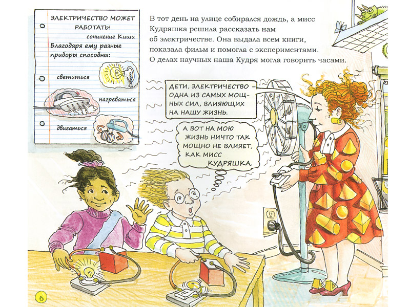 Каждая книжка представляет собой одну «тематическую» экскурсию. И эта экскурсия в буквальном смысле – приключение (небезопасное), участниками которого оказываются дети школьного класса и их учительница, мисс Кудряшка (или мисс Кудря). Мисс Кудряшка – не просто разговаривающий «робот», в задачу которого входит транслировать различную информацию. Это совершенно замечательный образ, чем-то напоминающий Мэри Попинс, чем-то – уважаемых учителей-волшебников Хогвартса. Но мисс Кудряшка использует свои магические умения для того, чтобы знакомить детей с естественнонаучными явлениями. И это переворачивает привычные представления о полной противоположности мира науки и мира чудесного. В книжках Джоанны Коул и Брюса Дегена мир природных явлений и есть самое чудесное, что только может быть. И то, что мисс Кудряшка пользуется разными волшебными ухищрениями, чтобы приобщить детей к знаниям об этом мире, кажется совершенно естественным. Мисс Кудряшка даже одевается необычным образом. О новой теме дети каждый раз узнают по ее платью: оно декорировано тематическими элементами, причем иногда – довольно вызывающе. Если, к примеру, детям предстоит изучать тему органов чувств, то язычки туфель учительницы выглядят как настоящие языки. А если детям предстоит изучать насекомых, ее платье оказывается расшитым насекомыми. И т.д.