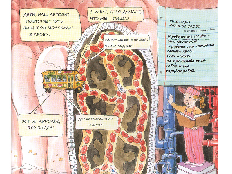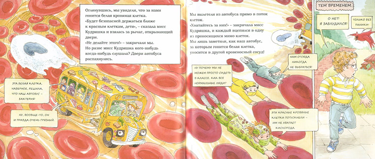 Вообще яркая образность и событийность изложения – удивительная особенность книжек про волшебные автобусные экскурсии. Казалось бы, в научно-популярной книге трудно избежать нудноватых объяснений – как ни отбирай материал. Здесь же все объяснения «имплантированы» внутрь динамичных событий: «Оглянувшись, мы увидели, что за нами гонится белая кровяная клетка… Двери автобуса распахнулись. Мы вылетели из автобуса прямо в поток красных клеток. «Хватайтесь за них!» – закричала мисс Кудряшка, и каждый вцепился в одну из проносившихся мимо клеток… В следующий момент мы влетели в сердце».