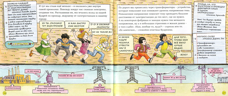 Это ощущение усиливается благодаря картинкам. Они наглядно и выразительно демонстрируют нам «природные ландшафты», в которые попадают дети: например, внутреннее пространство желудка, в котором «стены ходили ходуном, а в окна плескался желудочный сок». Или внутреннее пространство проволоки, по которой с бешеной скоростью несутся электроны, а между электронами – дети.