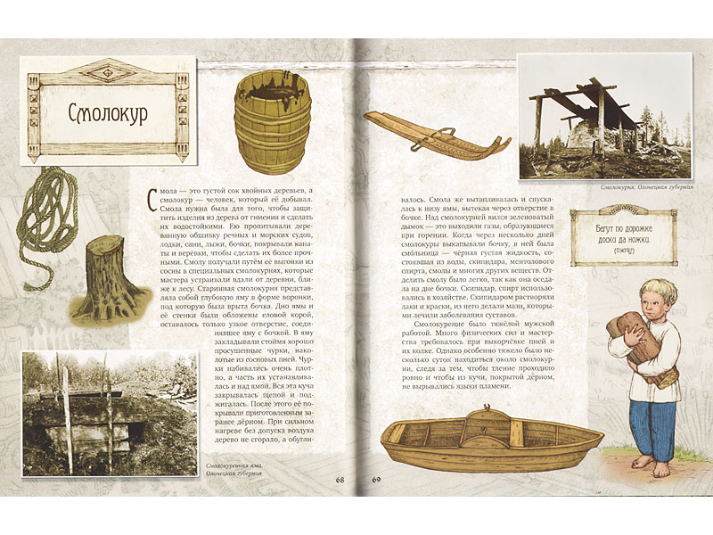 Это настоящая энциклопедия деревенской жизни. Ее автор – главный научный сотрудник отдела этнографии русского народа Российского этнографического музея Изабелла Шангина. Потому и тексты получились серьезные, глубоко раскрывающие повседневную жизнь русских крестьян. Но при этом автору удалось избежать избыточного академизма и «школьной» сухости в изложении. Благодаря живым, теплым рисункам и старинным фотографиям читатель легко и надолго погружается в новое для себя пространство. Он словно совершает неторопливую прогулку в компании крестьянских ребятишек по богатому русскому селу, где всего в достатке – и кузнецы есть, и вышивальщицы, и звонари, и мельники. Прогуливается и заглядывает под навесы деревенских мастерских, останавливается на пороге избы, где семилетняя «пестунья» качает младенца, наблюдает за тем, как артель плотников строит новый дом. И неожиданно открывает для себя множество совершенно неизвестных деревенских профессий, например, смолокура и бороноволока. К тому же в каждой главе ребенок существенно расширяет свой словарный запас, знакомясь не только с новыми профессиями, но и с диковинными названиями рабочих инструментов, вроде кельмы печника (это такая специальная лопатка для выкладывания глины) или ладуши синильщика (особым молоточком, которым набивали краской узор на ткань).