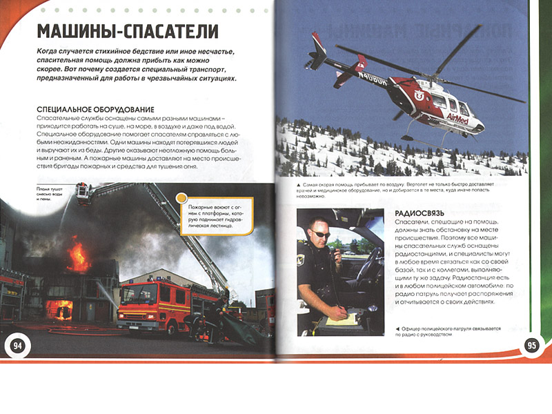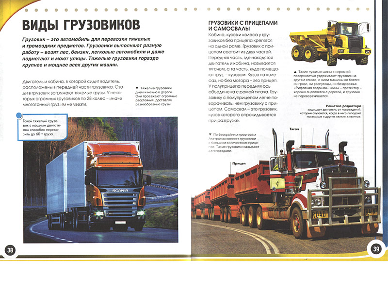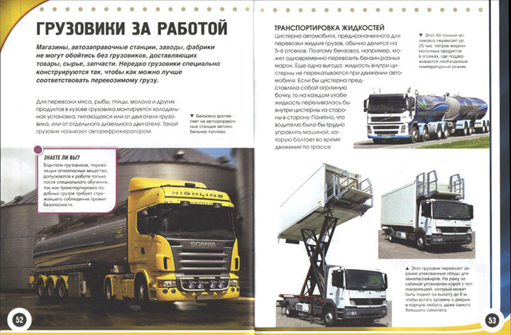 Тексты внутри тематического раздела тоже скомпонованы педагогически продуманно. Вот, к примеру, глава про грузовики. В начале – самые интересные, неожиданные факты о них, изложенные в коротких предложениях и напечатанные крупными буквами. Это что-то вроде аннотации, приглашения к чтению: «Кабина современного грузовика оборудована удобной кроватью, холодильником, микроволновкой и телевизором». «Грузовик, двигающийся по трассе без водителя, ‒ не фантастика, а реальность». И действительно, трудно удержаться от желания немедленно читать дальше, потому что хочется узнать подробности. А дальше внутри большой энциклопедии о машинах открывается настоящая маленькая энциклопедия о грузовиках – статьи про разновидности машин и их работу, детальное (и притом понятное ребенку, что немаловажно) описание устройства и работы двигателя с прилагающимися крупными рисунками-чертежами, подробный рассказ и фото устройства кабины современного дальнобойщика. При этом внутри статьи текст набран разными шрифтами – от очень крупного, броского, до совсем мелкого, в расчете на читателей разного уровня подготовки и заинтересованности. Так что кое-что отсюда может почерпнуть и мой средний сын, которому скоро пять. Особенно ему нравится разглядывать яркие цветные фотографии, рассказывающие о работе специальных машин спасателей, пожарных, дорожных служб. Кстати, все они снабжены небольшими, но достаточно информативными подписями о том, что именно изображено, какую роль играет эта часть машины, чем конкретно заняты люди. Впрочем, даже и двухлетнему младшему интересно разглядывать крупные, иногда почти на всю страницу фотографии и незаметно для самого себя пополнять свой растущий словарный запас. Мелким шрифтом внутри статьи идет информация «на вырост» – подробные технические характеристики, объяснение специальных терминов. Вы знаете, что такое аутригер или, к примеру, гидравлический подъемник? Вот и я тоже. А теперь ребенок сам с этим разберется и еще вам расскажет. Кроме того, по всему тексту книги рассыпаны вставочки «знаете ли Вы?» с особо интересными, но уже довольно сложными для восприятия фактами, которые пригодятся скорее на исходе возраста начальной школы. Так что и старший, восьмилетний сын, для которого была куплена книжка, еще несколько лет сможет удовлетворять свой интерес к машинам.