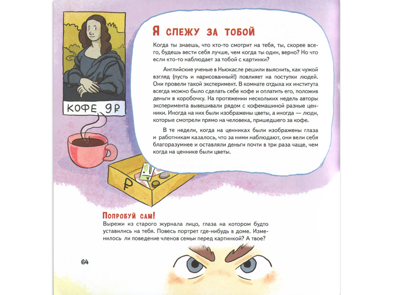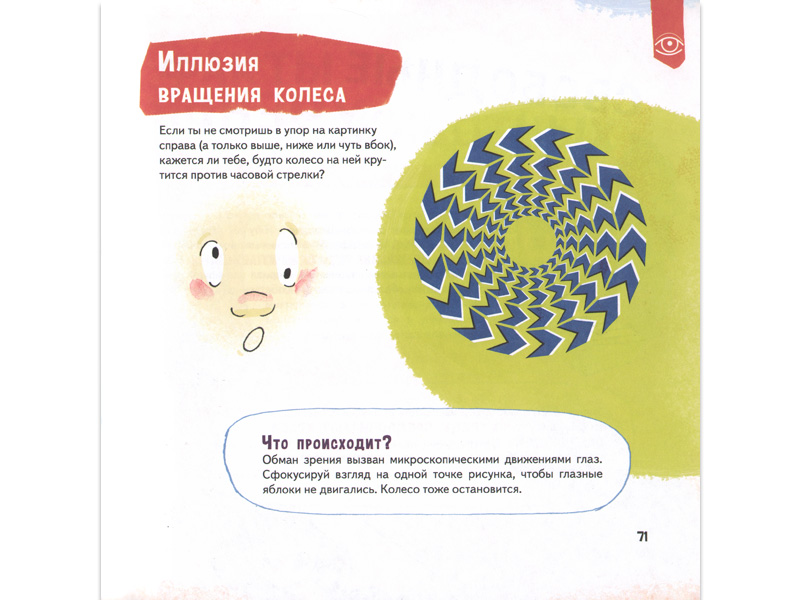 Мне кажется очень полезной вещью то, что в книге на первый взгляд неочевидно. Разыгрывая свой мозг разнообразными способами, выдвигая гипотезы и зачастую обманываясь в своих ожиданиях, мы вместе с детьми учимся не воспринимать мир однозначно, сомневаться и пытаться посмотреть на ситуацию с разных сторон. Темное и светлое вдруг оказывается одинаковым, стопроцентно неподвижная картинка начинает вращаться, а теория относительности становится применима не только в физике, но и в обычной жизни.