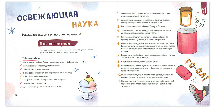 К одному из самых вкусных (в буквальном смысле) и желанных экспериментов мы готовились очень долго. Дело в том, что в книге юным исследователям предлагалось самостоятельно приготовить мороженое, параллельно изучая процесс теплоотдачи. Но кто-то из нашей юной компании всегда был то простужен, то берёг горло после болезни, и заманчивый опыт раздела «Освежающая наука» откладывался на неопределенный срок. И вот, наконец, настал момент, когда мы торжественно достали две жестяные «конфетные» банки разных размеров. Меньшую, на 500 мл, зарядили нужными ингредиентами и плотно замотали скотчем. Затем поставили ее в емкость побольше (1,5л), засыпали доверху льдом с солью, плотно закупорили и, в строгом соответствии с инструкцией, начали играть самодельной «мороженицей» в футбол. Всего через полчаса внутри банки футболистов ждало прекрасное натуральное мороженое! Честно говоря, внутри десерт был мягким и больше походил на густой молочный коктейль (вероятно, в процессе производства дети его малость недопинали), но восторгов это не убавило, и съедено все было за считанные минуты.