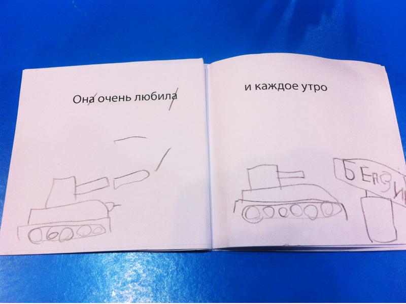 Потом дети придумывают и рисуют на каждой страничке, где их герой (или героиня) живет, что любит делать, что любит есть, где любит гулять и спать. Простая, казалось бы, история, но детская фантазия самые простые сюжеты поворачивает абсолютно неожиданным образом. У нас уже были сказки и про ежика, который любил прыгать на батуте, и про танк, который любил купаться в фонтане, и про мобильный телефон, который больше всего любил заряжаться.