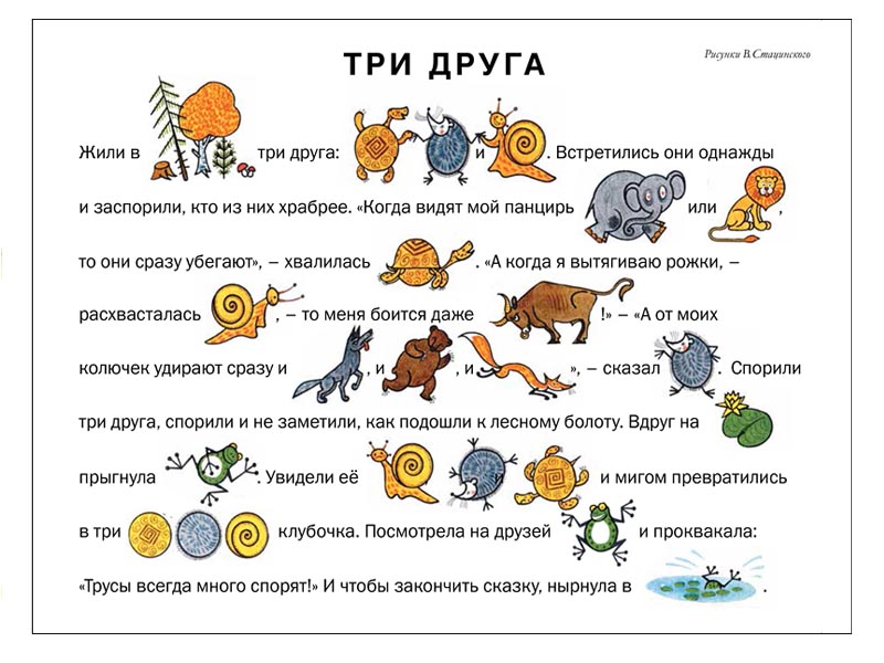 Читаем дальше: «Жили в лесу три друга» ‒ и видим рисунок веселых черепахи, ежа и улитки. Дети опять подсказывают, называя трех друзей. История развивается, прибавляются новые герои, чтение все также переходит от взрослого рассказчика к детскому хору и обратно.