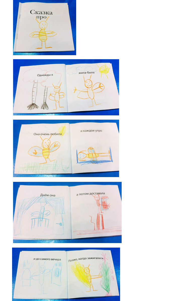 Я сделала небольшие заготовки из обычных листов А4, разрезанных на три продольных полосы. Если сложить их все вместе и скрепить степлером, получится книжка-малышка. На каждой странице – буквально несколько слов: «Жил-был», «Каждое утро он» и т.д. На обложке написано «Сказка про» ‒ а дальше каждый ребенок рисует на обложке того, про кого он хочет сочинить эту сказку.
