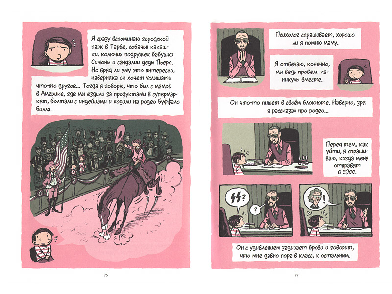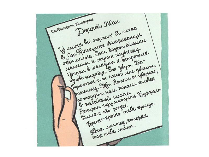 «Моя мама в Америке, они видела Буффало Билла» ‒ это история маленького мальчика, который читает по лицам взрослых, но не хочет, отказывается облекать свои догадки в слова. Вопросы замирают у него на языке. На картинке ‒ пустое белое облачко со знаком вопроса. Он не спрашивает о том, где его мама, потому что боится услышать ответ. До тех пор, пока не произнесены слова, мама Жана и Поля для них жива. Только она очень далеко, где-то там, в Америке. Ей там хорошо, ведь она видела Буффало Билла.