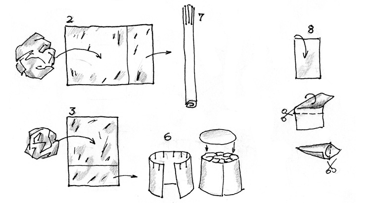Склеим три комочка вместе, перевернув их складками вниз и приступим к деталям. Руки, метлу, ведро и нос сделаем из обрезков ксероксных листов. Руки – два завернутых газетных комочка (рис.3), метла –трубочка, один из краев которой надрезан на мелкие полоски (рис.7). Ведро выполним из полоски и круга. Вначале изготовим цилиндр (можно немного расширить книзу) надрежем край, отогнем, приложим к листу, обведем и вырежем круг (рис.6). Нос выполним из полоски, закрученной по форме конуса (рис.8).