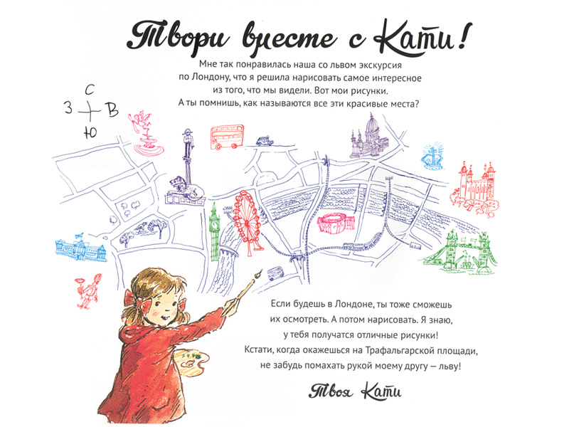 К концу этого необычного путешествия, к последней странице книги, в голове малыша складывается довольно объемная и интересная картинка про Лондон. Хотя составлена она из совершенно разных, вроде бы никак не связанных между собой ярких фрагментов. Но именно так мыслит и запоминает мир маленький ребенок – без всякой системы выхватывает из окружающего то, что привлекательно и интересно для него прямо сейчас, и складывает потом целый мир как пазл, из кусочков, по какой-то своей собственной интуитивной матрице, в соответствии с которой все почти чудесным образом встает именно на свои места. Сколько раз я наблюдала это у собственных детей и сколько раз убеждалась, что такая автодидактика во много раз полезнее для маленького ребенка, чем самая совершенная педагогическая методика взрослых.