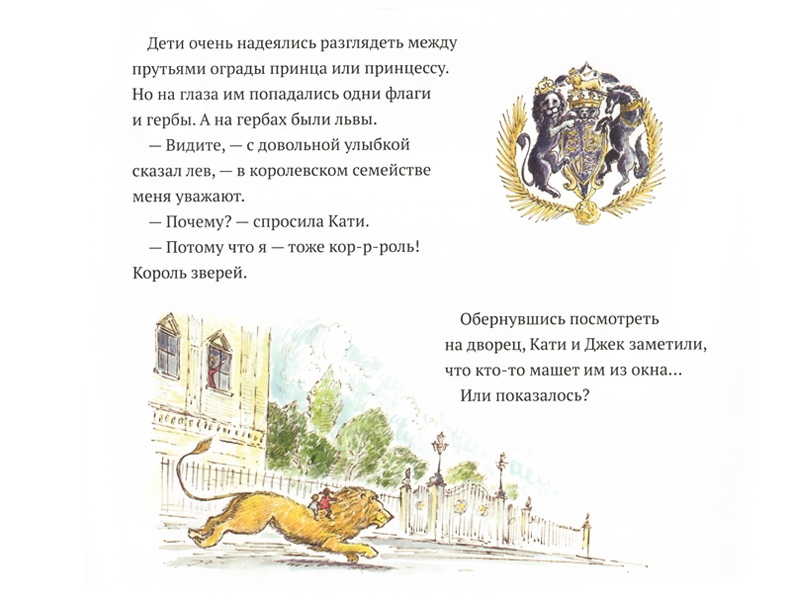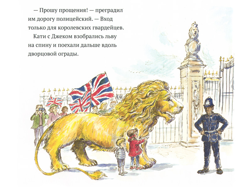 Бабушка давно обещала внукам показать красивые здания и площади Лондона, да все было некогда. И вот уже дети крутят головами во все стороны, выглядывая в окно автобуса. Но бабушка устала от долгой дороги, присела на лавочку на Трафальгарской площади и задремала. А детям скучно просто так чинно сидеть рядом (как это понятно маленьким читателям!). Кати и ее брат решают вкарабкаться на спину бронзовому льву. А он вдруг оживает и несет детей над Лондоном... Какой четырехлетка откажется от такого заманчивого предложения? Разумеется, он весь уйдет в переживание этого воображаемого перелета. И, совершенно не собираясь ничего такого «учебного» запоминать о Лондоне, мгновенно запомнит все. Огромные картинки, на страничный разворот, внезапно распахиваясь перед ребенком, создают полную иллюзию того, что это он, сидя на спине льва, буквально выпрыгивает навстречу собору святого Павла, Парламенту, Тауэру и Букингемскому дворцу. И конечно, бессознательно запечатлевает их силуэты в памяти. А заодно и некоторые забавные факты, предложенные автором, ‒ вроде специальных королевских ворон, которых многие сотни лет охраняют стражники Тауэра, или королевских гвардейцев в красных мундирах, охраняющих, в свою очередь, покой английской королевы.