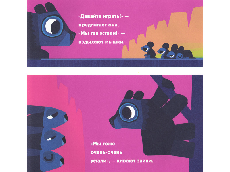 В книжке «Всем спокойной ночи» изображены спящие звери, но кажется, будто они дышат и производят во сне какие-то звуки (это ощущение поддерживается и текстом: «Мышки уже спят, носики сопят»); мама-медведица не просто обнимает медвежонка, а тихонько его качает. А уж там, где изображена какая-нибудь погоня (в «Тихо! У нас есть план»), герои того и гляди выпрыгнут за пределы книжной страницы – такой энергией наполнен рисунок.
