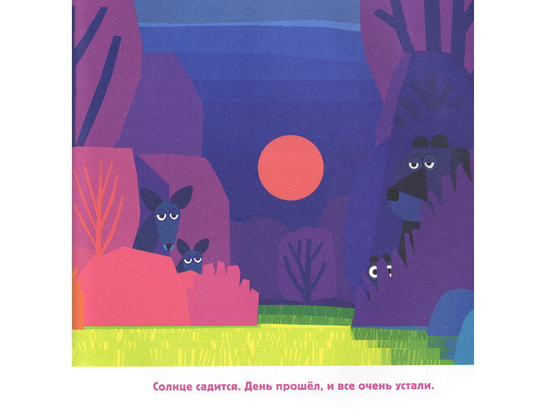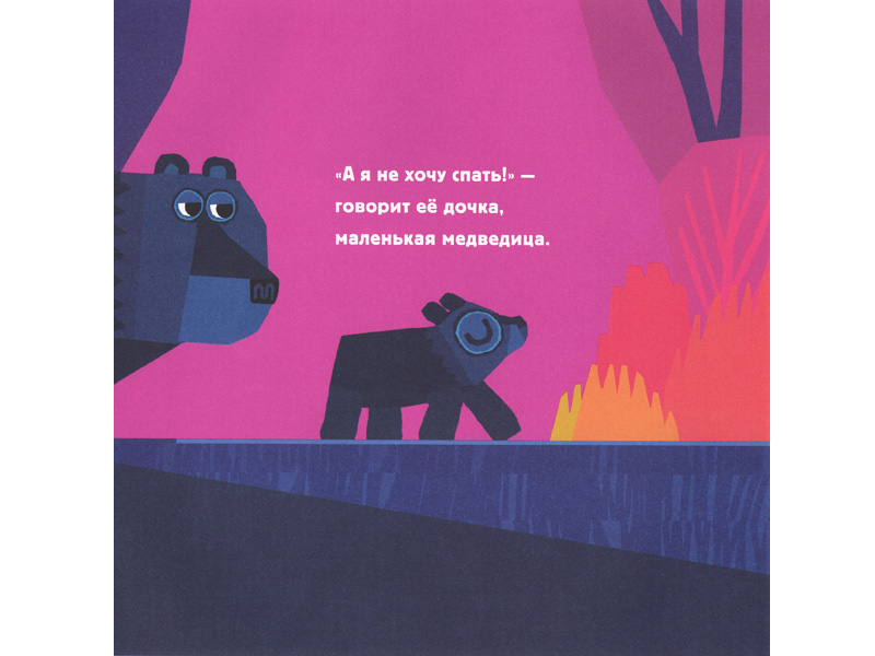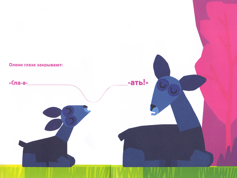 Зайки спят точно так же, издавая те же самые звуки. И олени спят точно так же. Ну разве не радость для маленького читателя? Кроме таких совсем уж понятных «надписей», есть повторяющиеся слова. Например, слово «спать». Причем оно визуально «растянуто», как долгий зевок: на одной половине разворота «спа-», на другой – «ать». Отличная находка!