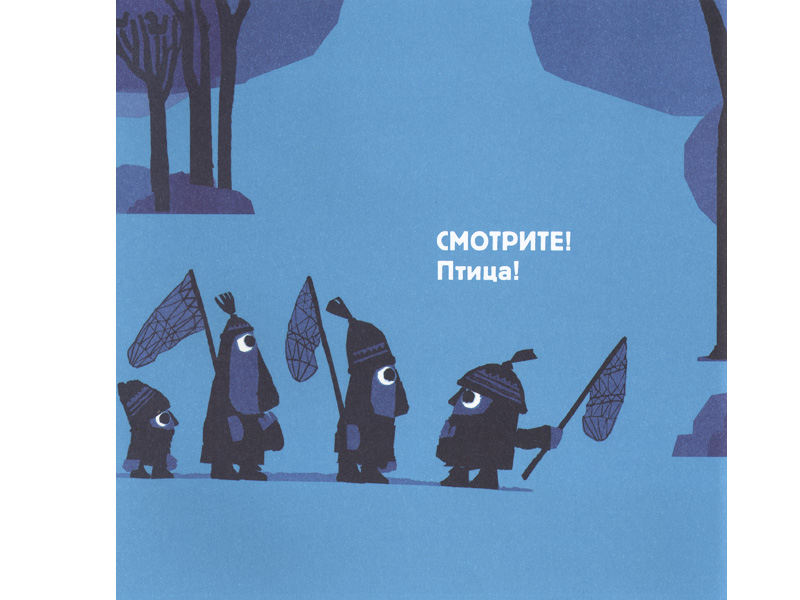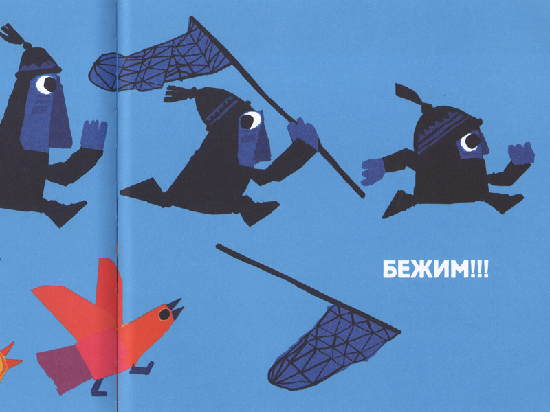 Персонажи нарисованы крупно, поэтому все внимание читателя сосредоточено на них. Они «собраны» по принципу аппликации из цветной бумаги: вот этот кусочек – туловище, к нему «приклеивается» голова. Почти вся голова – «лицо», почти все лицо – глаза. Глаза персонажей тоже сделаны аппликативно – из кружочков и половинок кружочков ‒ и утрировано эмоциональны. «Прочитать» их эмоции сможет даже самый маленький читатель.