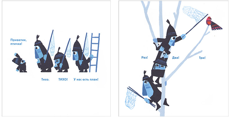 Текст книги «Тихо! У нас есть план» целиком состоит из таких повторяющихся слов. Главные повторяющиеся слова – «тихо» и «У нас есть план!», а еще по страницам во множестве рассыпаны слова «раз», «два», «три».
