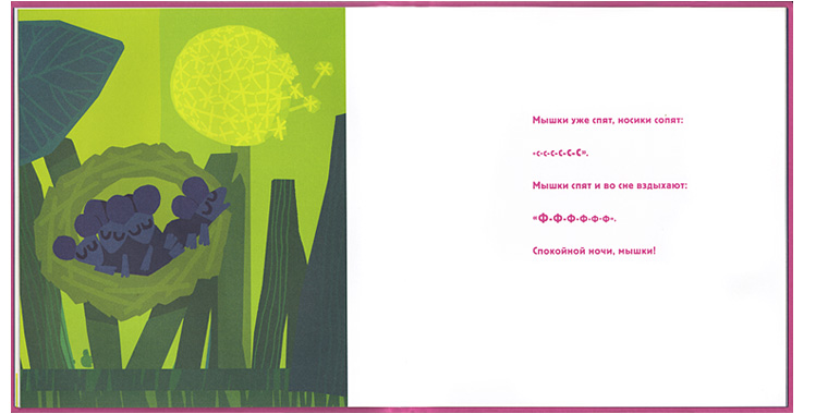 Текста в книгах мало, и он предельно лаконичен. Но, что важно для начинающего читать ребенка, в книге «Всем спокойной ночи» много звукоподражаний, которые переданы с помощью одной повторяющейся буквы: