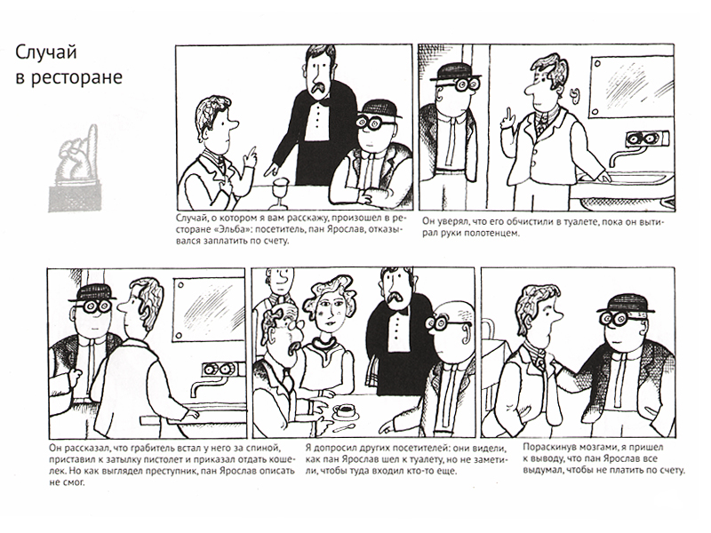 Я обратила внимание на эту книгу исключительно потому, что это комиксы. То, что это комиксы детективные, было делом десятым – просто хотелось уже наконец переключить Леву с чтения французских комиксов «Пласид и Мюзо» на что-то новое ‒ сколько уже можно хохотать над приключениями лентяя и хулигана Пласида и его верного друга лисенка Мюзо?! И вот встретились чешские комиксы 70-х годов ‒ «Загадки детектива Щуки». Я и не могла представить, как сильно эти короткие черно-белые истории затянут Леву в свой лихо закрученный детективный мир.