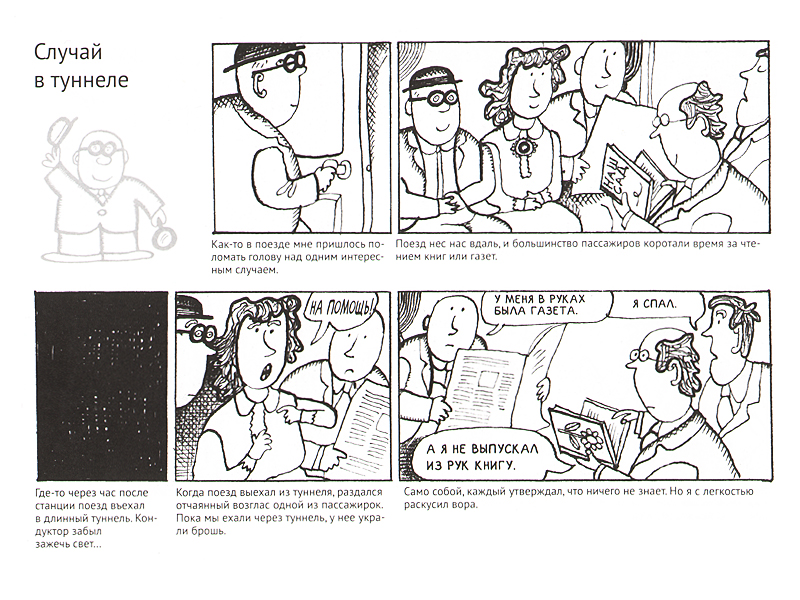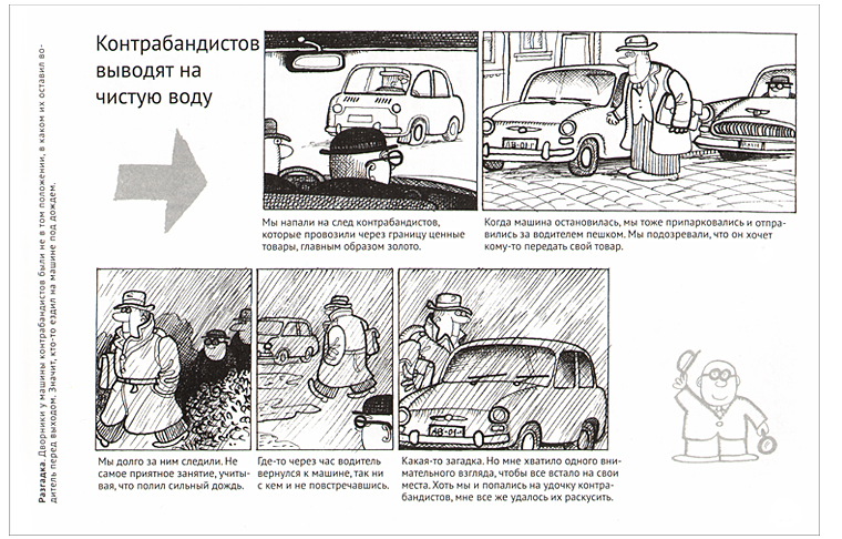 Каждый сюжет занимает одну страницу. История изложена в четырех, максимум пяти рисунках, под каждым рисунком ‒ короткая подпись. В названии каждой истории заложен вопрос, на который надо найти ответ, а в углу страницы, у корешка, располагается разгадка. Технология чтения простая: читаем вместе, внимательно изучаем иллюстрации и пытаемся ответить на вопрос, то есть раскрыть преступление вместе с детективом Щукой. Если совсем не получается, читаем разгадку.