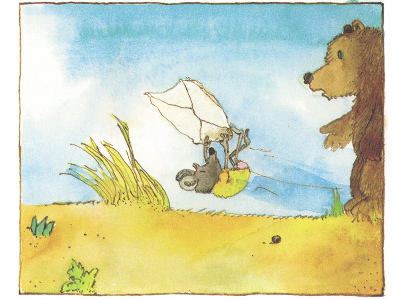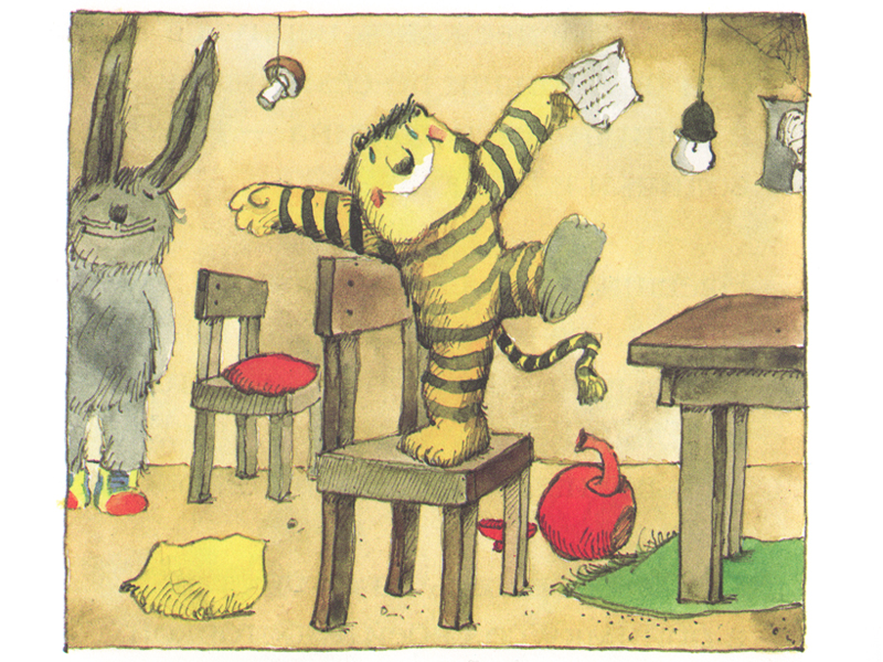 И тогда они договариваются, что Медвежонок из «дальнего далёка» напишет домой письмо. Вот только доставить его некому: Гусенок не может помочь, потому что спешит на похороны (дорогие родители, пожалуйста, не пугайтесь этого слова в детской книге, ребенок его воспринимает совершенно не так, как вы!), рыба не расслышала просьбу и уплыла, а шустрая Мышка просто не смогла унести конверт, такая она маленькая и слабая. И тут появился Заяц в башмаках-скороходах! Он в два счета доставил письмо Тигренку ‒ и очень вовремя, потому что тот «опять был грустный-прегрустный. Ничего ему не хотелось». Получив письмо, Тигренок «от радости пустился в пляс сначала на столе, потом на стуле, потом на кровати и диване». Он прочел письмо «от начала до конца и в другую сторону – от конца до начала». Жизнь сразу наладилась, у Тигренка появились силы и энергия, чтобы встретить Медвежонка вкусной едой и чистым домом.