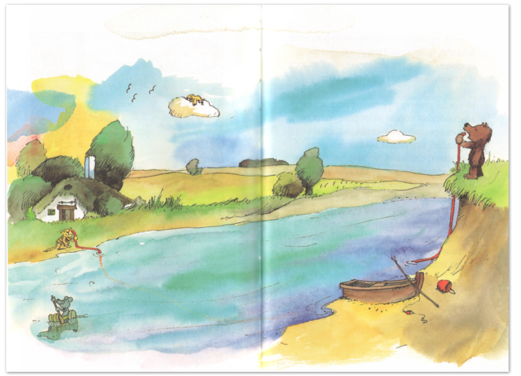 Вскоре в лесу появились желтые почтовые ящики. Но выдумщики Тигренок и Медвежонок пошли еще дальше: они придумали домашний телефон из садового шланга. Со временем они проложили телефонную линию через реку, чтобы можно было звонить кому хочешь даже на другом берегу реки. А в далекую страну, в Африку, например, письмо можно было отправить воздушной почтой. Жизнь в лесу сильно изменилась.
