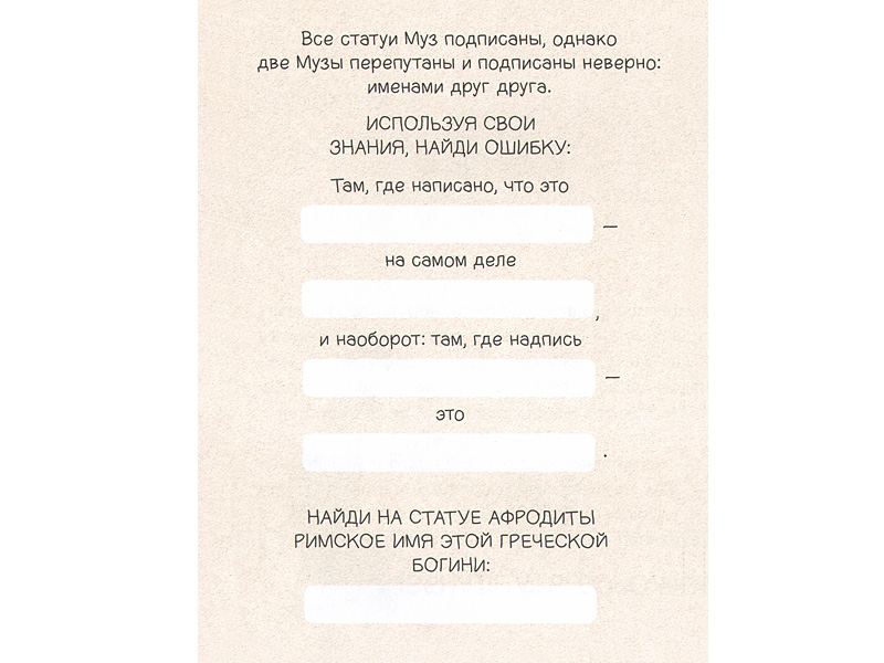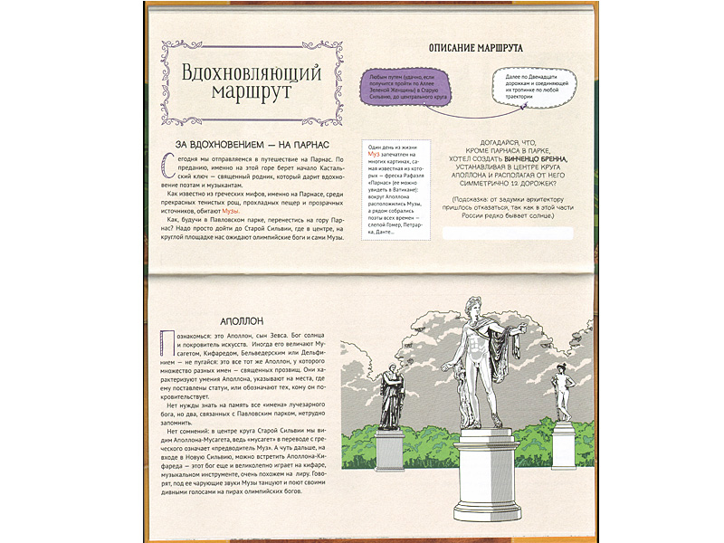 Путеводитель получился не только информационно насыщенным, но и игровым, я бы даже сказала, детективным. Внутри каждого маршрута обязательно есть таинственные обломки предметов или изображения и надписи, запрятанные в самых неожиданных местах и связанные с какой-то загадкой. Вот, например, что можно встретить на Вдохновляющем маршруте: «Все статуи Муз подписаны, однако две Музы перепутаны и подписаны неверно, именами друг друга. Используя свои знания, найди ошибку». Несколькими страницами ранее дети познакомились с «профессиональной специализацией» покровительниц наук и искусств, их аллегорическими символами, и теперь у них появляется замечательная возможность применить новые знания. Задачки такого типа обычно очень нравятся детям. Без путеводителя многие точно пробежали бы мимо, лишь мельком глянув на белых каменных тетенек в странных одеждах. А теперь не только остановятся, но и, скорее всего, запомнят.