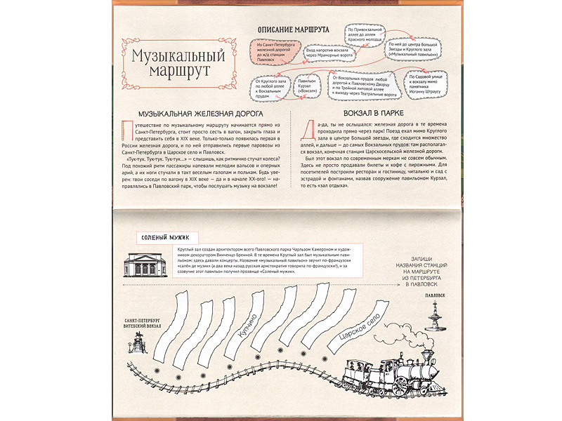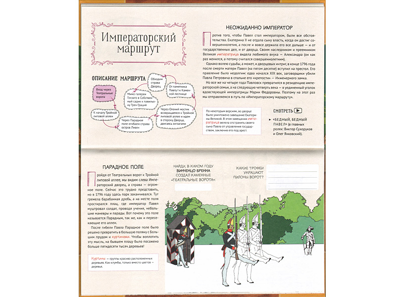 Пять разных маршрутов – Музыкальный, Семейный, Императорский, Вдохновляющий, Живописный – позволяют выбрать путь, соответствующий потребностям и настроениям детей. Если они больше увлечены историей, отлично подойдет Императорский маршрут, на котором можно узнать о том, где император Павел тренировал своих солдат и почему он очень поздно, на пятом десятке лет, стал российским императором и правил всего четыре года. Если дети любят неожиданные и интересные факты, тогда история о том, что вокзал – это совсем не то место, куда приходят поезда, несомненно, увлечет их по Музыкальному маршруту. А для девочек, начинающих читать свои первые романы, этот маршрут откроет Павловский парк как очень романтическое место. Впрочем, о любви расскажет и Семейный маршрут, где дети погрузятся в закрытый, непарадный мир домашней жизни императорской семьи. Главная героиня этого маршрута – Мария Федоровна, супруга императора Павла, о которой обычно мало что известно детям. А между тем именно она создала неповторимую атмосферу парка, с его соединением в одно целое природы, архитектуры и скульптуры, она была замечательной матерью, вырастившей десятерых детей, двое из которых станут императорами после своего отца. Тонким художественным натурам в путеводителе предложены Живописный и Вдохновляющий маршруты, на которых можно научиться читать скульптуры-аллегории как интересную книгу и много рисовать самому, копируя, например, узор чугунной ограды и мраморные вазы.