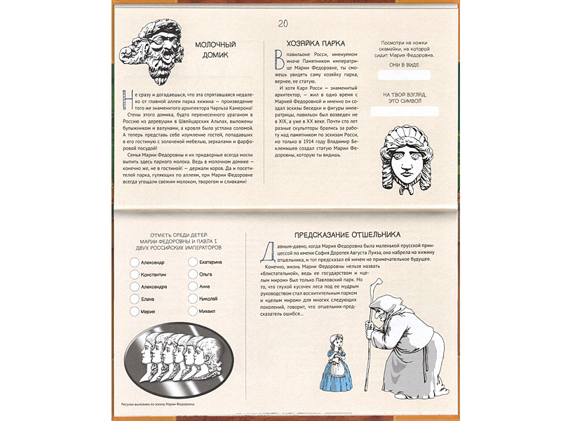 В этом путеводителе много романтических историй и жизненных драм: непростые взаимоотношения императора Павла с его матерью, Екатериной Великой, трагическая история несостоявшейся любви композитора Иоганна Штрауса и юной Ольги Смирнитской, таинственное предсказание отшельника, которое услышала в детстве Мария Федоровна… Так что «Павловский парк» будет интересен и ребятам постарше, младшего подросткового возраста (10‒12 лет), которые уже увлечены не столько поглощением новой информации, сколько рассматриванием себя в новом пейзаже, примериванием к себе ролей и жизней прежних обитателей парка. Для подростков также очень актуальны ссылки на интересные книги и фильмы, которые можно освоить уже дома, если история задела за живое. Впрочем, и они будут с не меньшим увлечением, чем их младшие братья и сестры, искать таинственные предметы, спрятанные в парке, и радоваться его красоте. Главное – благодаря этой книге каждая семья может выстроить тот маршрут, который необходим именно сейчас, именно этим детям. А значит, скорее всего, у них установится своя собственная, личная связь с Павловским парком, и им захочется вернуться сюда снова.