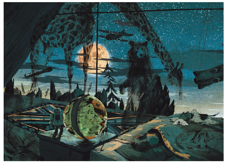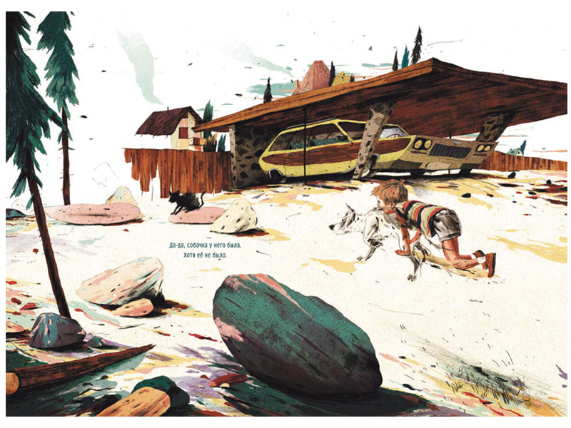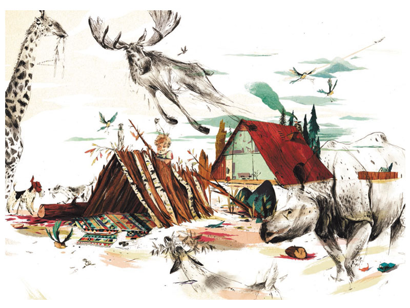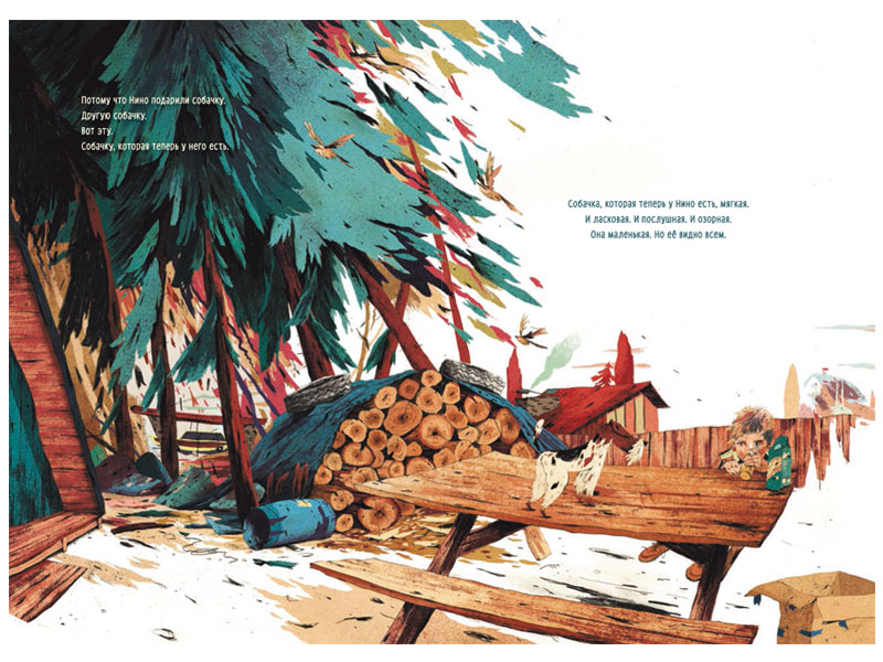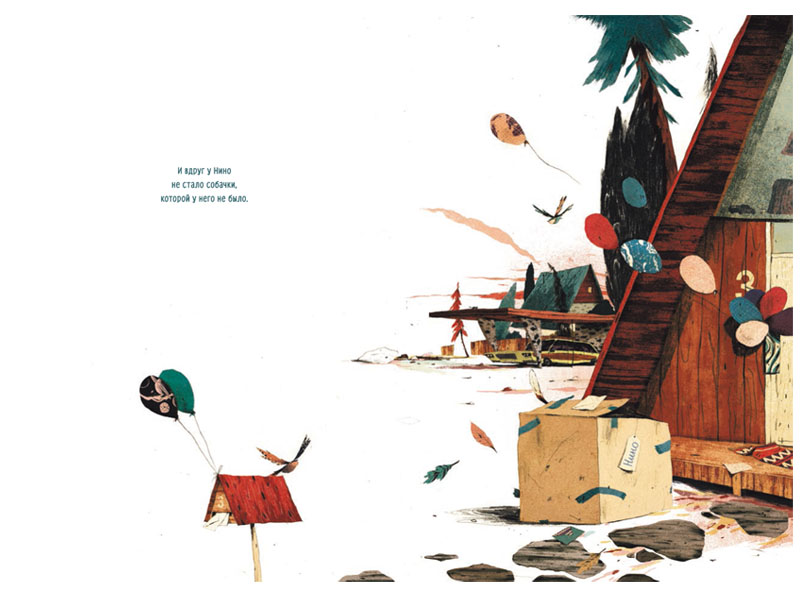 Когда появилась настоящая собака, Нино выдумал себе «оленя, которого у него нет», «зебру, которую он никогда не видел», небегемота, неносорога и нежирафа с немедведем! Но на последних разворотах книги, где совсем нет слов, Нино издалека наблюдает, как обе его собаки – видимая и невидимая – знакомятся друг с другом, а потом Нино спит в окружении своих диковинных зверей, и собаки спят у него на одеяле.