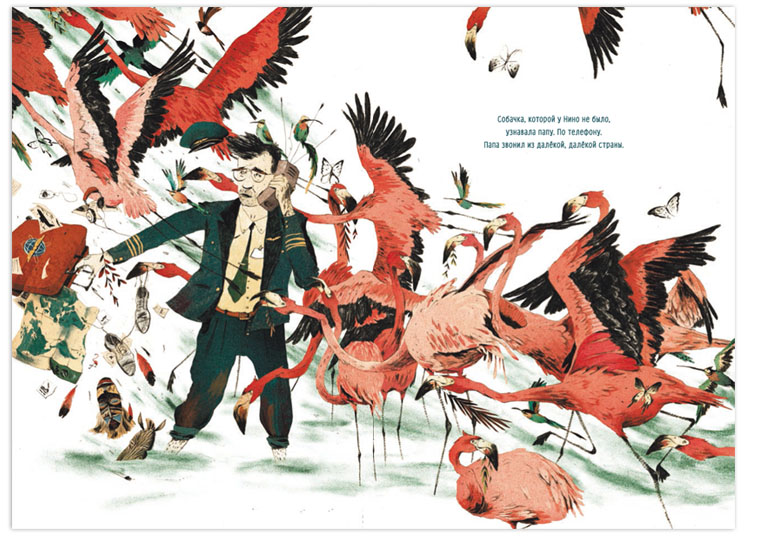 Воображаемая собака Нино связана с отцом, которого нет рядом (на рисунке мы видим его в форме летчика, по щиколотку в воде, среди стаи фламинго). Вероятно, Федор этого до конца не осознает, но отец Нино тоже находится в статусе воображаемого, «делает то, о чем думает Нино». И мальчик любит его таким…