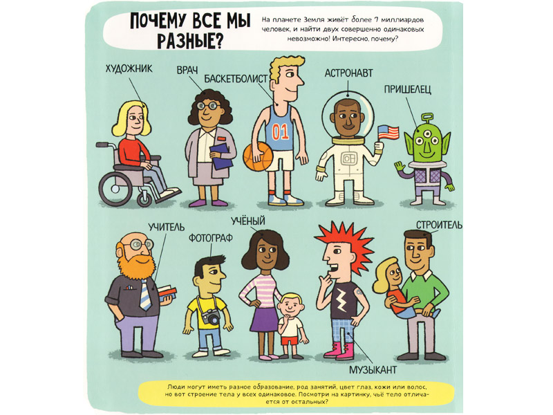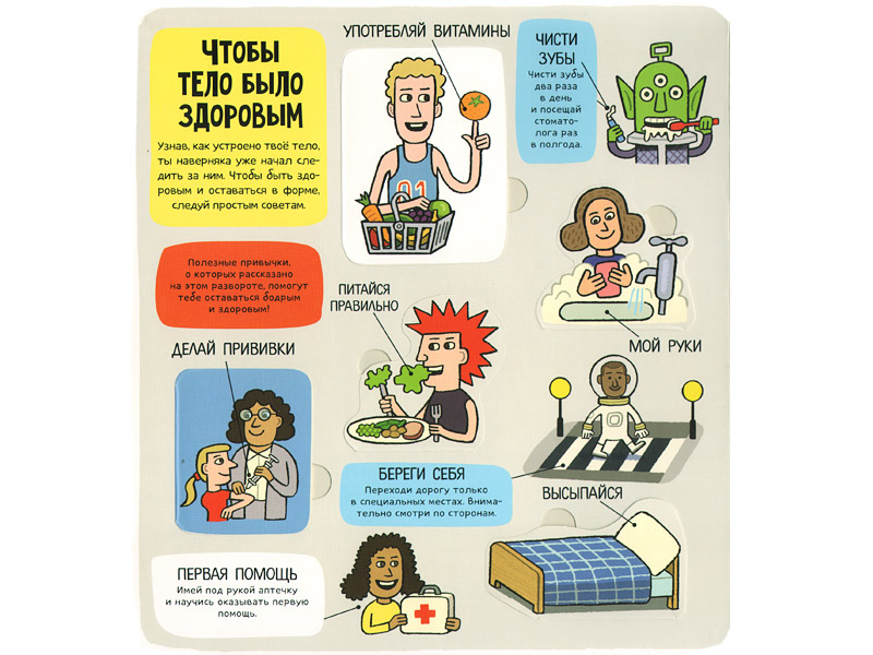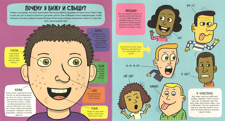 И задания есть понятные, интересные: «Можешь догадаться, что чувствуют эти люди?» Рассматривая разворот «Почему я вижу и слышу?», можно предложить ребенку прочитать возгласы, издаваемые персонажами. (Возможность что-то самостоятельно прочитать не стоит упускать ни при каких обстоятельствах.)