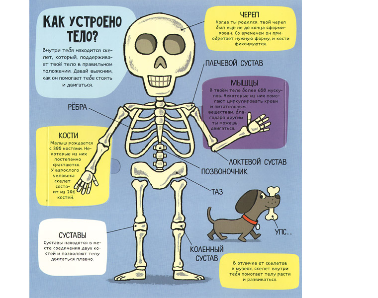 Что касается именно чтения, то, с точки зрения доступности текстов, эта книга для ребенка 8–9 лет. В этом возрасте ребенок уже способен воспринять информацию и о «процессе кровообращения», и о том, что «сосуды – это трубки, по которым циркулирует кровь», и о том, что мускулов у нас 600, а костей – 206.