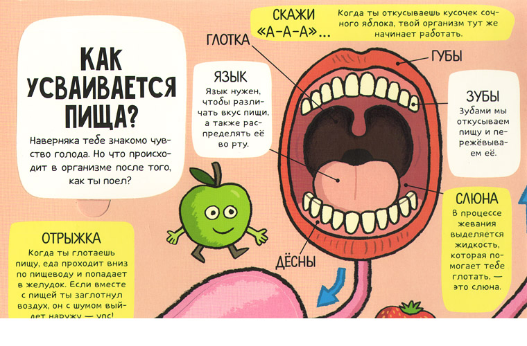 Но это несложно. Повторюсь, малышу достаточно «назывного» уровня чтения. Ему достаточно показывать картинки, на которых нарисованы внутренние органы человека, и называть их: это сердце (оно у тебя вот тут, за этими грудными косточками прячется), это желудок (в книге говорится, что желудок похож на эластичную сумку – «сумку» надо оставить, а «эластичную» опустить), это легкие, и т.д.