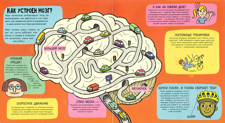 А картинки в книге интересные, смешные, объясняющие сложное понятие с помощью яркого и доступного образа. Малыши любят машинки, играют с ними, собирают их, ломают их. Так что образ работающего мозга, по «дорогам» которого двигаются машинки (различные сигналы), очень понятный. А там еще и светофоры стоят! У нас в мозгу есть светофоры? Движение нервных сигналов, оказывается, регулируется?