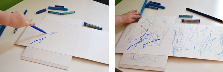 Наш морской театр мы делали вместе с дочкой. Она с помощью карандашей, фломастеров и мелков создавала фантастически синий фон (поэтому внешняя поверхность театра получилась такой экспрессивной). А я делала декорации и фигурки персонажей.