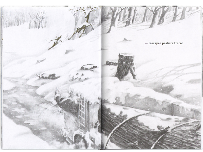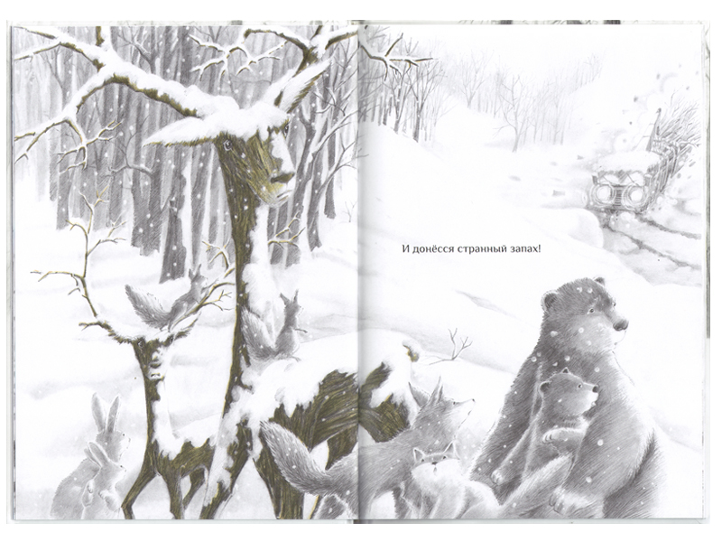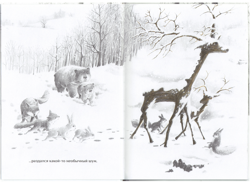 Как это часто бывает в книгах-картинках, главное здесь – иллюстрации (текста совсем мало, на некоторых разворотах его совсем нет). Причем иллюстрации черно-белые: трагические события происходят зимой. Только олени, маленький и большой, выделяются на черно-белом: они теплые, коричневатые, цвета древесной коры.