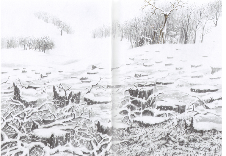 В лес приезжают лесорубы и вырубают деревья. На одном из разворотов открывается вырубка ‒ это панорама, состоящая из пней. Она чем-то напоминает зимнее кладбище. Все тонет в снегу. Печаль тоже тонет.