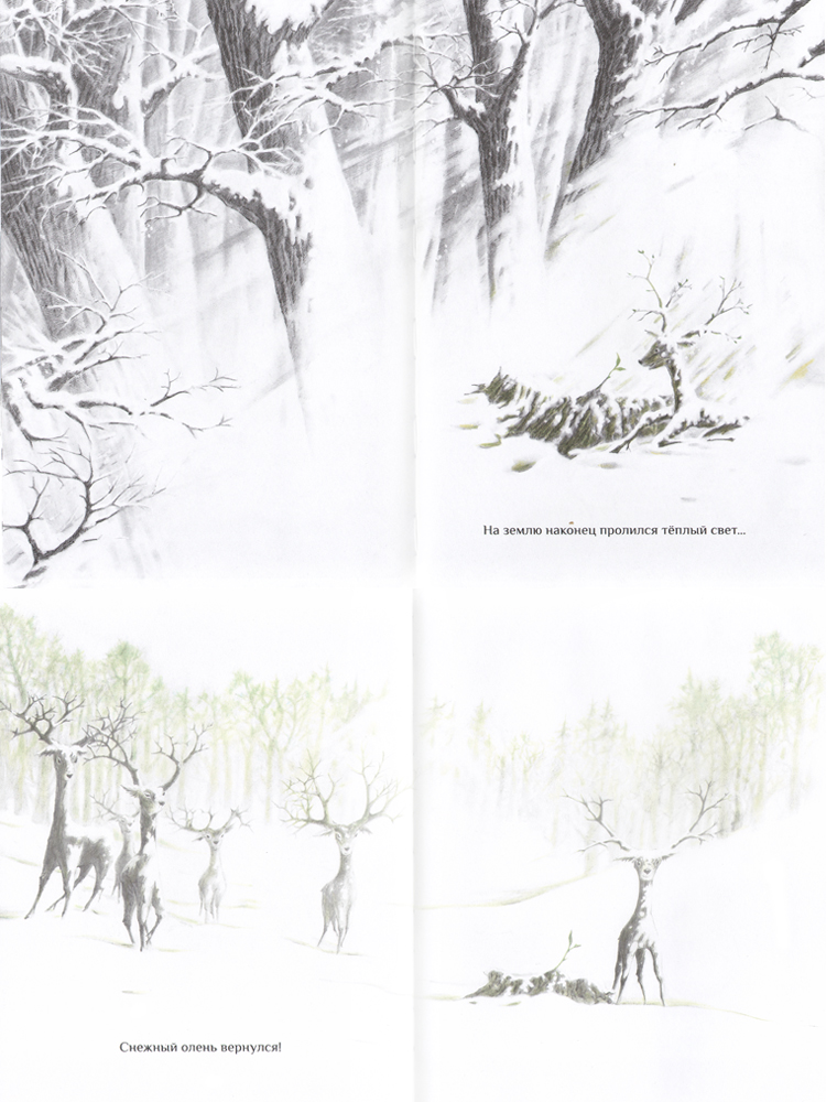 Нет! На одной из последних страниц мы видим: на пеньке появился побег. И олененок глядит на него и… что? Это вопрос к ребенку. И ребенок непременно увидит, что маленький олененок улыбается зеленой веточке. На предпоследнем развороте мы видим целое стадо оленей. Они как бы приходят на смену единственному большому оленю, которого мы видели в начале книги. А на заднем форзаце – распускающиеся деревья. Это по настоящему цветной разворот. Только краски здесь самые нежные из возможных, прозрачная акварельная зелень.