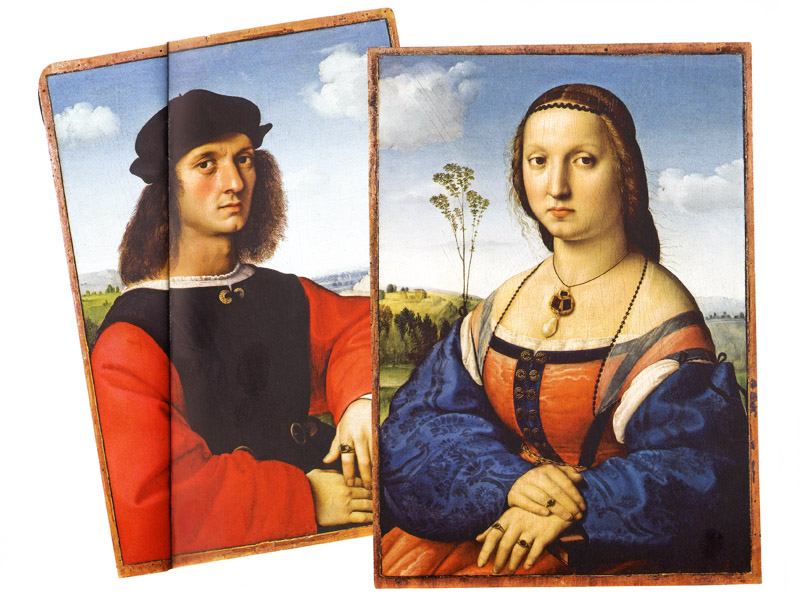 Тогда можно поговорить с ним о том, что такое рисунок тушью, мозаика и фреска, с которыми читатель встречается во второй части книги ‒ именно в этих техниках выполнены портреты слона. Такое разнообразие мне кажется особенно удачным: ребенок может сам выделить технические особенности мозаики и фрески, совершенно не подозревая при этом, что осваивает искусствоведческую практику. На одном из разворотов второй части малыш видит крупное изображение слона тушью и автопортрет Рафаэля. Это хороший повод обсудить, что такое портрет и автопортрет, чем они похожи и различаются. А потом можно перейти к портретам супружеской четы Дони, тоже авторства Рафаэля, и попробовать определить, что за люди перед нами – задумчивые, добрые, злые, упрямые, ласковые? (Здесь мне кажется важным не опережать ребенка в оценках, а дать ему возможность рассуждать самому.) Их лица и фигуры столь выразительны, что это будет очень легко и интересно.