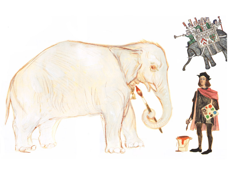 Для пятилетнего мальчика оказалось важным и достаточным, что «папа римский» – это такой особенный человек, который жил давным-давно в Италии (про Италию Митя хорошо знает из любимой «Новогодней книги» Джанни Родари, о ней мы рассказывали на «Папмамбуке»). А дальше совсем просто: Италия – очень красивая страна, и, конечно, этот папа очень любил все красивое. Поэтому у него был любимый художник Рафаэль, который писал картины по его просьбе. А еще папа любил разных необычных животных, и поэтому король соседней страны Португалии однажды прислал ему в подарок очень красивого (это замечательно видно на рисунках) настоящего индийского слоненка. До этого никто в Италии слонов не видел. Разумеется, папа захотел запечатлеть такое чудо природы в красках и пригласил своего любимца Рафаэля.