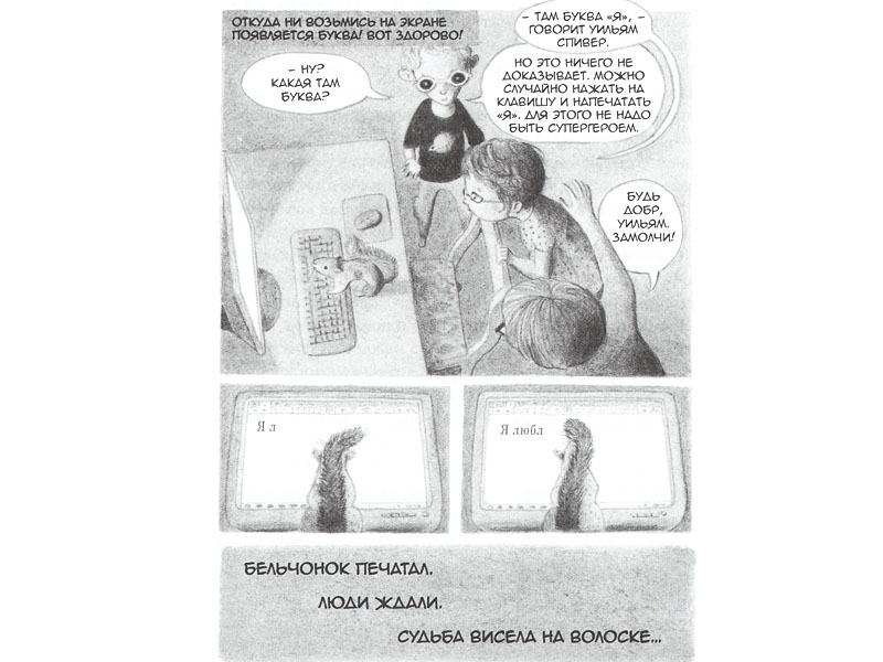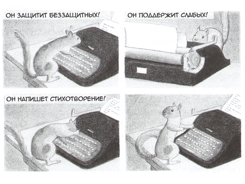 В чем же секрет? Во-первых, повествование у Кейт ДиКамилло – насквозь иронично. Она постоянно, особенно в самых патетических сценах, как бы отступает на шаг и смотрит на происходящее со стороны. Во «Флоре и Одиссее» это отстранение особенно наглядно. В наиболее эмоциональные моменты Флора начинает видеть мир как комикс: с облачками слов или мыслей, висящими над головой собеседника.