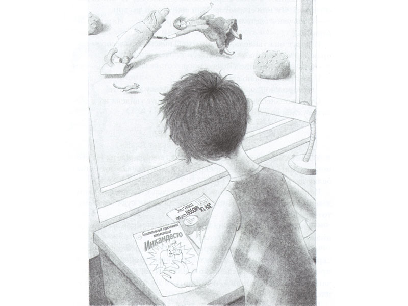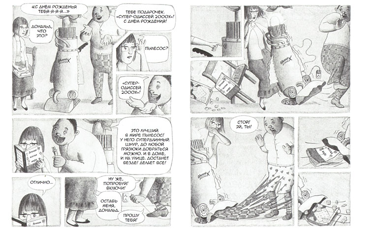Кстати, некоторые, наиболее динамичные эпизоды «Флоры и Одиссея» тоже рассказаны с помощью комиксов. И этот ход абсолютно оправдан с художественной точки зрения. Это не иллюстрация литературного вкуса героини-подростка и уж тем более не заигрывание с читателем-подростком. Комиксы использованы в сценах потасовок и там, где события развиваются так стремительно, что словесное описание сильно тормозило бы их.