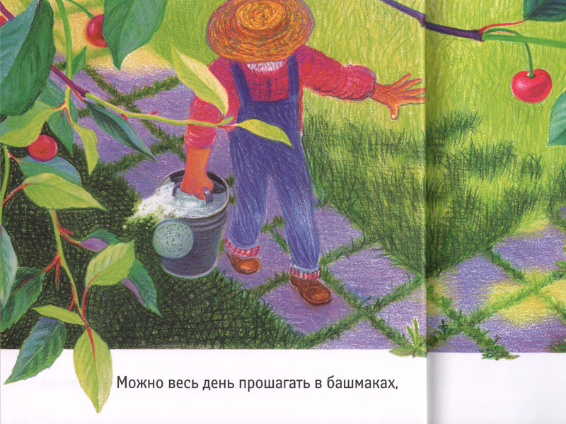 Стихотворение написано о самых обыкновенных башмаках безымянного садовника. Башмаки выступают верными друзьями и помощниками в работе. Такой взгляд на вещи, я уверена, многим маленьким читателям покажется неожиданным. После чтения стиха про башмаки садовника Федор стал вспоминать, чем он занимается на улице в своих синих сандалиях и какие у них вместе могут быть общие впечатления о прожитом дне и вообще о лете. Мы даже записали со слов сына историю «Два синих сандалика». По ходу повествования выяснилось, что, хотя Федины мальчишеские забавы очень отличаются от работы садовника, но его сандалии должны быть не менее прочными и выносливыми. Отдельной похвалы заслуживают иллюстрации Ирины Киреевой, которые не только сопровождают текст, минимизируя количество вопросов маленького «почемучки», но и обогащают его. А еще в книжке чувствуется какая-то нежность по отношению к обыкновенным вещам, и, мне кажется, такая атмосфера создается именно благодаря остроумным и талантливым рисункам Иры Киреевой. Вот такая замечательная получилась история про башмаки садовника.