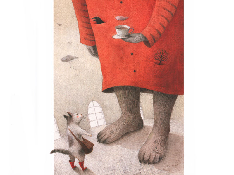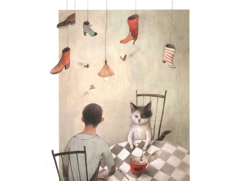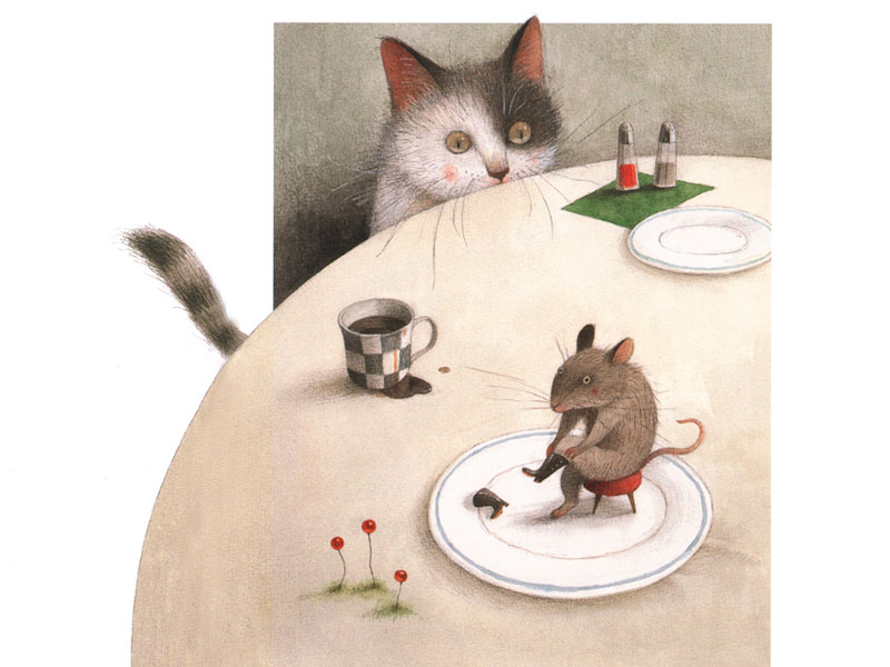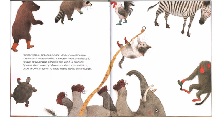 Однажды кот принес великану удивительные по красоте сапоги, над которыми сапожник особенно потрудился. «Не могу представить, кто, кроме Вас, достоин их носить. Правда, они такие крошечные...», – говорит кот людоеду. Дальше последовала всем известная провокация, и великан отреагировал на нее, как мы этого и ожидаем. Но всё в этой сказке так ловко завязано на обуви. Замечательная картинка: великан-мышка, сидя на табуреточке, с явным нетерпением натягивает заветные сапожки – и все это на тарелке. И эта тарелка на следующем развороте оказывается пустой: только сапожки, пара алых пятнышек – как намек на произошедшее – и столовые приборы (кот-то воспитанный – кушает вилкой и ножом). Изумительно. Поступок кота мотивирован совершенно по-другому: съесть-то он великана съел, но тем самым отомстил обидчику и восстановил справедливость. Вот он сидит под столом (кстати, в своих рекламных походных сапогах) и умывается в полном удовлетворении.
